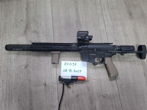 Dazu gibt eine "hohle" Gans von Ares. Das ganze war einmal eine Octarms mit 16 Zoll, ich habe aber Outerbarrel und Handguard gekürzt.