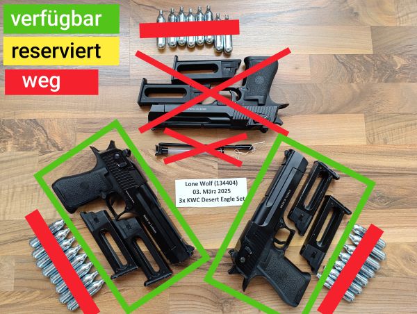 Weiteres Update: nachdem sich die zuerst verkaufte Desert Eagle nachweislich als problematisch erwiesen hat, obwohl sie bei meinem letzten Funktionstest vor dem Verkaufsangebot einwandfrei funktionierte und seitdem nicht mehr beschossen wurde, deklariere ich hiermit die beiden verbleibenden, die schließlich das gleiche Modell vom gleichen Hersteller sind, als "möglicherweise defekt, einwandfreie Funktion nicht garantiert"!