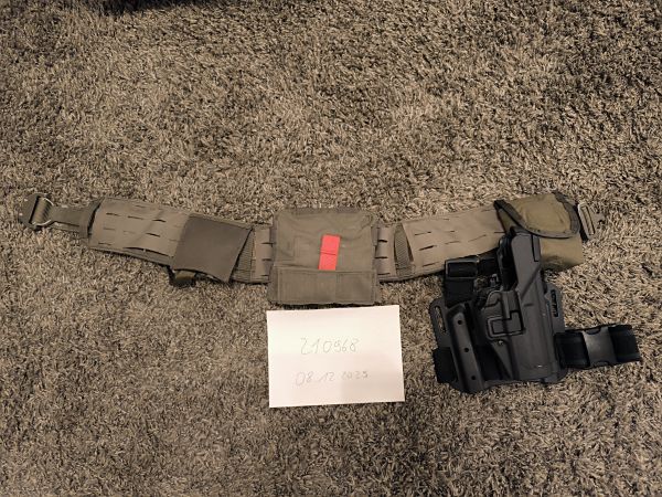 Mit dabei ist ein Dumppouch von Tasmanien Tiger, eine Medicpouch von TT, eine Universalpouch von LHT und einen Blackhawk Serpa Level 2 Holster für HK USP, oder HK P8 A1.
