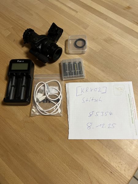Dazu kommen vier passende Akkus und Ladegerät und ein Rubber Eyecup Ring.