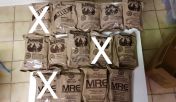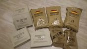 Mehrere Essensrationen (Einmannpackungen / Meal ready to Eat) der Bundeswehr und der US Army für das Überleben im Freien.