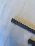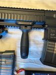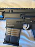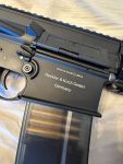 Technisch wurde nichts verändert, äußerlich einiges schon, sie hat den 417 Stock, Flashhider , Klappkorn, Gasblock, die SMR17 Rail , ein Zweibein, den HK Frontgriff in schwarz. Und mein Persönliches highlight die G27 Markings die gelasert sind.