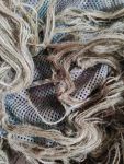 An ihm wurden selbstgefärbte und gezupfte Juttefäden aus Juttesäcken befestigt. Der Großteil der Fäden ist mehrfarbig gefärbt wurden, einzelne auch in Natur Farbe belassen, auch pakete von nicht gezupfter Jutte sind verknotet.