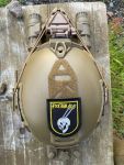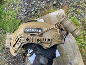 Alle Teile sind in sandfarbenem Finish gehalten und harmonieren optisch hervorragend. Der Helm verfügt über Side Rails, Shroud und Klettflächen, das NVG-Modul lässt sich klappen, das PVS-31 ist realistisch nachempfunden und über eine Standard-Halterung befestigt.