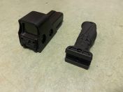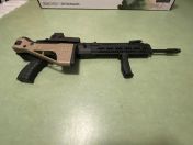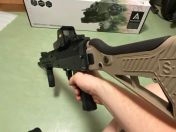 Der originale Buttstock wurde nach einem „Kontakt“ mit einem Stahlbetontrümmer durch einen ICS G33 SFS Folding Stock in TAN (MH-25, Begadi) ersetzt. Dafür musste das Schanier mit einem neuen Custom Build aus Nylon-Kunststoff ersetzt werden.