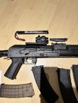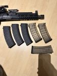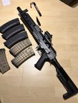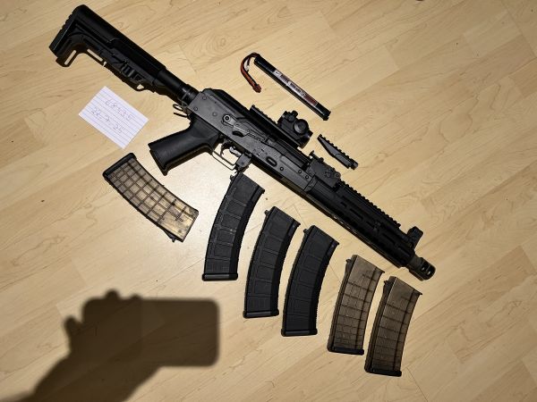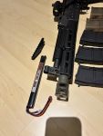 Sie ist die Standard Variante mit Microschalter ohne Mosfet. Ich habe sie hier vor einiger Zeit als Cqb Projekt gekauft. Leider Hab ich’s dann aber nicht geschafft es umzusetzen. Sie funktioniert sehr gut und auch ohne Mosfet ist sie recht zufriedenstellend. Sie kommt mit einem Reddot auf einer Sidemount und eine kleine risschiene zum Wechseln der Kimme ist auch dabei. Außerdem 3Arcturus Magazine und 3 Bulgarian Style Mags, wovon eins leiter die Lippe weggebrochen hatte. Die andren haben die Stelle geklebt so das es nicht passieren kann. Zusätzlich kommt eine Waffentasche mit.
