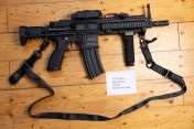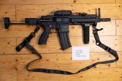 Zusätzlich ist ein Haltegriff und ein Gurt an der Waffe montiert und wird zusammen mit der Waffe verkauft.