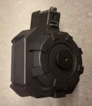 Das Drummag hat eine Kapazität von 2000 schuss und wird per knopf nachgefördert. Betrieb mit Block Batterie.