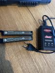 Inklusive aller abgebildeter Akkus, Ladegerät und einem Magazin.