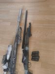 Es wurde ein kürzerer Outer verbaut und ein nofridge Schalldämpfer.Der inner Barrel ist ein edgi custom stainless Steel 455 mm dual bore von 6.00 auf 6.05 mit einer vertieften Endkrone .Ihr habt somit mehr fps und tdm eine sehr gute präzision .Das bucking ist ein modify x range 65 shore . Die Hop unit wurde durch eine Action Army vsr unit ersetzt .Der Bolt hat eine custom Edelstahl nozzle bekommen die der spartanischen ähnelt ,nur das die von mir noch mal nen halben Zentimeter länger ist für noch ein klein wenig bessere Abdichtung .Der Gummi am Bolt wurde durch einen von G&G ersetzt .Outer und Receiver sind bei dem Gewehr miteinander verschraubt mittels barrel Lock screw ( wie bei kjw ) und nicht wie bei Tanaka nur durch die vordere Schraube am outer .Das Visier ist ein Westhunter .Mit dazu gibt es eine peq 15 laserbox ,ein Harrys Style bipod und ein Patronen Gurt in 308 .Der Woodland Schaft hat einen Receiver mit f damit der bespielt werden kann wenn es gewollt wird ( der andere hat das F auf dem Stock ) .Der originale outer hat einen custom CNC Adapter auf 14 ccw der 9 cm nach hinten in den outer geht .Somit habt ihr Luft bei der Wahl der inner barrel .Mit dazu gibt es 4 Short Mags wo aber 2 undicht sind (vlt repariere ich die noch mit wenn ich Zeit habe ) .