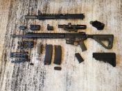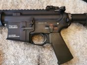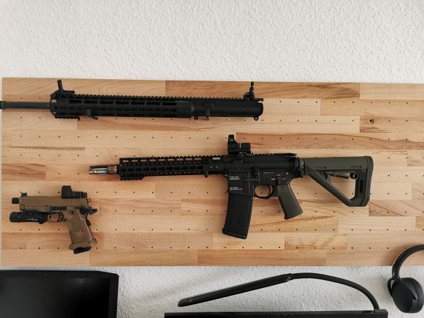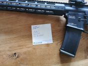 -ein langer (M16 Länge!) mit 55cm Innenlauf, Maple Leaf Hopupgummi, 20" Outerbarrel, Standard Bidcage Flashhider und 14" Keymodhandguard. Der receiver ist properitär, da passt nur das Rail von KWA dran wie zb bei der MKM Ar15. Ein QD Keymod Slingmount ist verbaut