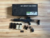 Ich verkaufe das nur im kompletten Set, heißt: Gewehr, 2x Amaxsuperio 11.1V Akkus, Ladegerät, 4 Magazine( bei einem ist die Noppe abgebrochen, siehe Foto), 3Punkt Sling, OVP, Rechnungen…alles da.