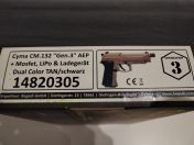 hier finden Sie eine Cyma CM.132 "Gen. 3" AEP in den Farben Dual Color TAN/schwarz, inklusive Mosfet, LiPo Akku und Ladegerät. Zusätzlich dazu nochmal den gleichen LiPo Akku.