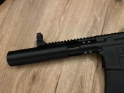 Der Schalldämpfer ist von Begadi. Dieser sitzt spielfrei im Handschutz und wird auf die Barrelnut/Base aufgeschraubt. Da der Lauf einen Stück in den Schalldämpfer ragt gibts dazu einen Spacer mit 14mm- Gewinde. Der Spacer zentriert zum einen den Lauf im SD, zum anderen kann man so einen Tracer im SD montieren. Der Spacer sitzt mit 0,1mm Spiel und verrutscht von alleine nicht.