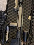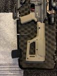 Verkaufe mein „DMR“ Build, da ich aktuell nur noch mit meiner kleinen 10“ MTW spiele, habe sehr viel Zeit in die Abstimmung gesteckt was sich bemerkbar macht. Auf der Area-M läuft sie als DMR mit 2J (gecront mit 0,30g BB´s) bei ca 110psi. Gespielt habe ich sie immer mit 0.40g BB´s, reichweiten teschnisch ist es auf der Schiesbahn der Area-M kein Problem Mann große ziele auf 80m zu treffen, oder anders gesagt zwei Bunkerreihen kann man locker überbrücken. Den Schlauch der MTW habe ich durch den Stock nach hinten verlegt, Der Anschluss für den AKKU befindet sich im Griff.