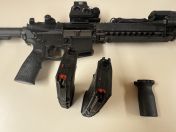 ich verkaufe hier meine VFC Daniel Defense MK18 Мod 1, in gutes Zustand. Die Kniffte hat noch kein Spielfeld gesehen, еs wurde nur auf einem privaten Schießstand geschossen und es wurden etwa 5000 Schuss abgegeben. Die Waffe weißt leichte gebrauchsspuren auf wie den Bildern zu entnehmen ist. Die beigelegte Magazine sind dicht - 2 St. V3 M4 Gas VMAG. Alles funktioniert einwandfrei.