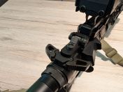 Das hintere Flip-Up Visier wurde mittels 3D-Druck Teil modifiziert und ist nach wie vor seitlich verstellbar. Das Korn auf dem vorderen Schalter/Taster für Laser/Lampe ist ebenfalls ein 3D-Druck in welchem ein in der Höhe verstellbarer Gewindestift sitzt. Somit gibt es eine funktionale Notvisierung unterhalb der Hydra-Mount.