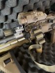 Teile: Vortex Strike Eagle „S“OPMOD Scope realsteel / Schussfest, Libelle montiert an Sopmod, Geissele Clone Scopemount qd, hochwertiges Holosun Docter Sight auf 45 Grad Mount, Silencer 7,56 angry gun mit 3 Pong Flashhider, VFC Original Stahl Flashhider, VFC original Alu Outerbarrel Short, Ratech Stahl Outerbarrel verbaut (alles 14 mm-/ccw), deaktivierte AN PEQ 15 UHP von Element , orig. Surefire Lampe deaktiviert, echtes B&T Bipogrip mit optionalen Endschraubkappen in FDE und schwarz wenn Bipod ausgebaut wird), orig. 5.11 padded V-Tac Sling, Blue Force Slingholder wired, VFC G28 Sling Holder fde eloxiert, Angry Gun Attachpoints zusätzlich am Upper, Tuning Ladehebel und Original Ladehebel, Angry Gun ACR Stock, hochwertiger Koffer abschliessbar, original Magpull Miad Griff, Element Railcover, WE Ersatzteile siehe Bilder usw und so fort.