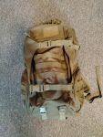 Am Boden befinden sich Schlaufen für z.B. Schlafsack und Isomatte. Ein Hüftgurt ist auch vorhanden und kann bei Bedarf im Rucksack versteckt werden, sodass er nicht stört. Die Front und Seitentaschen sind zudem mit Molle-Schlaufen versehen und können zusätzliche Taschen aufnehmen. Zur Personalisierung befindet sich auf der Oberseite zudem noch eine Patchfläche.
