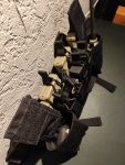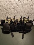 Der chest rig mit X Harness besitzt 4 M4 Pouches welche mit elastischem Pull tabs gesichert sind. Darüber sind nochmal 4 Pistol Mag Pouches, diese sind mit Elastik an der Pouch sowohl auch mit Pull tabs gesichert. Links und rechts sind jeweils 2 kleine GP pouches