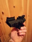 Auf der Oberseite befindet sich eine Kimme samt Lichtsammlerkorn und beidseitig je eine kurze RIS-Schiene für einen zusätzlichen RedDot oder ähnliches.