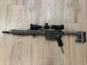 Mein Ziel war es, ein Ultra leichtes DMR mit bester Performance und Anbauteilen aus dem Real Steel zu bauen. Da nur ausgewählte Komponenten verbaut wurden, war der Geldeinsatz nicht gering. Mit allem drum und dran hat die Waffe über 2.000€ gekostet. Dafür ist aber auch ein individuelles Gewehr entstanden, welches es in der Form im Airsoft Bereich kein zweites Mal geben wird.