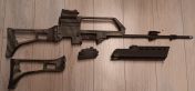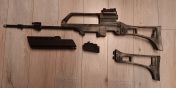 Hier seht ihr den Rest von einem S&T/Ares G36A1 mit C und normaler Schulterstütze, Handschutz EGB Style, Magazinschacht und HKV(da fehlt aber das Batteriefach, Abdeckung ist aber da) kann somit keine Garantie auf Funktion geben.