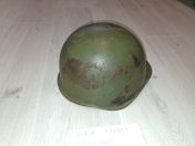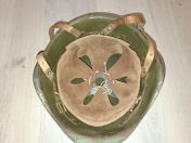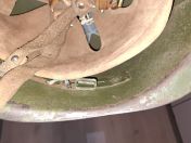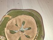 Wie zu sehen sind deutliche Lackschäden und Gebrauchsspuren vorhanden. Im Inneren ist das Innenleben eines NVA-Stahlhelm eingebunden.