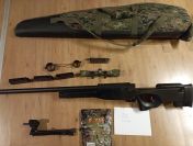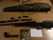 Das Gewehr hat im Lieferumfang drei Magazine, ein Scope (umklebt mit Flecktarnband) inklusive Verdeck für sonniges Wetter, Bipod, Speedloader, Tasche und 1 kg 0,32g Bio-BBs von Royal (ungeöffnet)