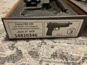 Verkaufe hier meine Cyma CM.132 Gen.3 AEP Beretta. Die Pistole ist gebraucht, aber hat keinerlei defekte und weißt optisch auch wenig Kratzer auf. Sie lag die meiste Zeit nur im Schrank und wurde vielleicht 10 mal wirklich genutzt. Die zwei Akkus sind auch noch in Ordnung, allerdings habe ich das kleine Magazin nicht mehr, sondern nur ein High-Cap-Magazin.