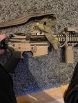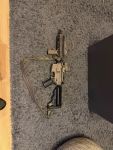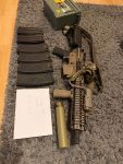 Verbaut sind: Holy Warrior Eotech, ein NGAL Dummy, Foregrip, Kunststoff Flip Ups (die originalen lege ich bei), einen Sling von Helikon Tex, die 2 mitgelieferten Original Magazine + 4 Arcturus Midcaps (auch von Begadi).