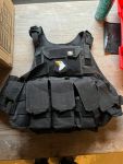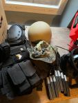 . Plattenträger mit 4x M4 Pouches, Utility Bag, Dump Pouch und vorne die kleine an der Brust. Größe L/XL, kein Plan. Hersteller hab ich jetzt gerade auch keinen mehr gesehen, Taschen teilweise von Tasmanian Tiger