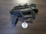 Die gute Ares CCC... ausgeliefert mit folding stock (ist wieder montiert, De-/Montage dauert keine Minute) ist die kleine sehr gut handlebar. Da ich in den Niederlanden aber in sehr engen Räumen damit gespielt habe, wurde sie zuletzt als Kurzvariante genutzt. Hierzu wurde ein Adapter aus Fernost genutzt (Die Montageplatte zur Gürtel- oder Molle Befestigung wird natürlich mitgeliefert). Hiermit kann die kurze M4 blitzschnell eingehakt bzw. gezogen werden, wodurch ich keine GBB mehr mit mir führen musste und durch die Bank weg meine M4-Magazine benutzen konnte.