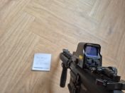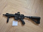 Verkauft wird eine GC16 WARTHOG der Marke G&G in der 7" Version. Die Waffe funktionierte einwandfrei bis zuletzt. Die Optik funktionierte bis zuletzt ebenso, zwischenzeitlich sind die Batterien aber leer. Neben der Optik findet sich zudem ein Handgriff am Gewehr. Der Schaft ist in der Länge verstellbar. In diesem kann auch der Akku verstaut werden. Kimme und Korn lassen sich bei Abbau der Optik ebenfalls wieder hochklappen.