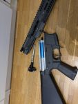 Der Stock wurde gegen einen Chubby Stock ausgetauscht, perfekt für CQB und Batteriekapazität. Dort ist leider ein Stück auf der Deckelseite abgebrochen, ich zeige in einem Bild darauf. Der Deckel hält noch fest, ist aber teilweise minimal schief drauf.