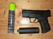 Die Pistole funktioniert einwandfrei, wurde nie gespielt, aber gepflegt. Ideale kleine Backup-Waffe. Zur Waffe dazu gibt es einen Schalldämpfer mit linksrum Gewinde-Verbindungsstück und eine Flasche ProTech-Gas 100 ml.