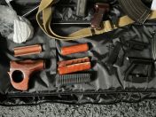 2 verschiedene Holz Upper & Lower Handguards, einer in die Richtung AK74 SU und einer in die Richtung African Warlord mit Holzgriff. Dazu noch der Stock Lower Handguard ohne Schiene.