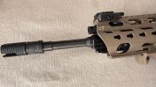 Im Gegensatz zur Variante von Arcturus kann bei der VFC auch der korrekte Lauf für diese Konfiguration verbaut werden. Der Außenlauf von Arcturus ist nicht zweigeteilt, sodass man den vorderen Teil nicht entfernen kann. Bei VFC kann der Teil vor dem Korn abgenommen werden und durch das hochwertige Verlängerungsteil von Clutch ersetzt werden. Dieses wurde hier auch mit dem Type F Flashhider und dem Bayonetthalter ergänzt.