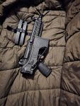 Sie kommt mit zwei Magazinen die mit einem Magazin-Clip temporär zusammen gehalten werden und einer Picatinny-Schiene.