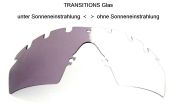 Besonderheit: Anstatt des werksseitigen grauen Glases beinhaltet dieses Set eine selbsttönende, photochrome TRANSISIONS von Galaxylens Scheibe – dieses Glas färbt sich bei Sonneneinstrahlung von klar zu dunkel selbst – zudem ist diese Scheibe "ventilated" d.h. am oberen Rand sind Belüftungsöffnungen eingeschnitten – dies verhindert sehr effektiv das Beschlagen insbesondere bei niedrigeren Temperaturen, da die Luft besser zirkulieren kann. Selbstredend erfüllt auch diese Scheibe die hohen Schutzstandards gem. ANZI Z80.3 und FDA.
