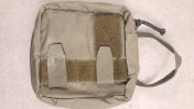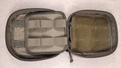 Die Abreißplatte wird mittels Malice Clips o.ä. befestigt und hat eine große Haken-Klett Fläche. Der Verschluss vorne erfolgt über eine Steckschnalle und ist längenverstellbar, je nachdem wie voll die Tasche ist. Oben gibt es eine kleine Klettfläche für einen San-Patch (mit dabei) sowie eine kleine MOLLE Fläche, auf der z.B. ein Tournequet mit Bungees befestigt werden kann, oder eine Schere oder eine andere beliebige Tasche.
