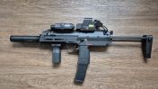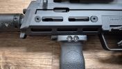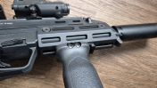 Am Gehäuse wurde ein MLOK Handguard von Clutch Precision verbaut, dafür musste der Klapp Handgriff abgesägt werden. An dem Handschutz wurde dann eine MLOK Picatinny Schiene mit Picatinny Griff verbaut.