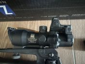Sie kommt mit einem ACOG Klon, mit Markings, leicht vergilbtem aber funktionierendem Lichtsammler und einem Trijicon RMR.