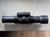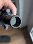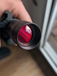 Es weist leichte Gebrauchsspuren am Gehäuse auf, die Glasoberflächen sind sauber und kratzerfrei. Eine Batterie und die Picatinny-Montageringe sind im Lieferumfang enthalten. Das Visier ist kompatibel mit Nachtsichtgeräten.