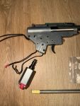 Ihr bekommt hier den Body mit HopUp+Gummi und Lauf, sowie eine komplette Gearbox, die definitiv Tuning und Zeit benötigt. Dazu lege ich noch mehr oder weniger die kompletten Internals einer weiteren Gearbox (Schrauben, Federn, etc.) + den originalen 6.00 mm Bolt Lauf der ursprünglich verbaut war, jedoch jetzt zu langsam ist.
