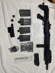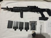 ich biete meine Begadi M14 zusammen mit 5 Magazinen an. Davon sind 4 bespielt, 3 davon mit Magpull. Zusätzlich wurde eine andere PEQ-Box verbaut. Diese ist nur an der Picatinny-Schiene befestigt und kann daher auch wieder abgenommen werden. Die originale ist ebenfalls dabei.