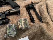 Ein Zweibein, 3 Magazine a 130 Schuss, ein Novritsch Scope, Handgriff (wie auf Foto zu sehen), Pic Schienen Erhöhung (ist am Scope), 2 OVP Tarnbandagen.