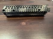 Hierbei handelt es sich um einen Nachbau eines free float Handschutzes, des Herstellers Daniel Defense. Der Befestigungsmechanismus dieses Handschutzes ist extrem stabil. Ebenso wurde dieser mit einem Tarnmuster, aus einem grün Ton und einer Sandfarbe besprüht. Mit dazu kommt ein "PICATINNY VERTICAL GRIP" von Knights Armament.
