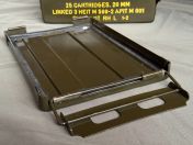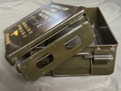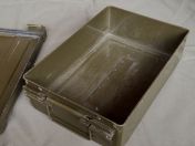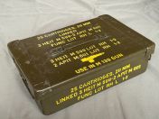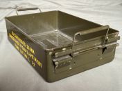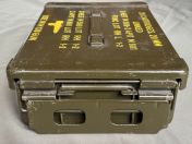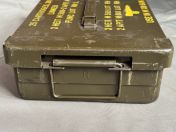 Ich verkaufe hier eine gebrauchte US-Munitionskiste aus der Vietnam Era. Diese robuste Metallkiste besitzt einen luft- und wasserdichten (vermutlich nur Spritzwasser) Verschluss und wurde ursprünglich für 20mm Munition der M139 Autokanone genutzt. Sie hat diverse Gebrauchsspuren und ist voll funktionsfähig.