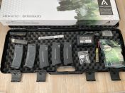 Die Änderungen sind der Einbau einer M120 Feder von Begadi mit der sie immer so ca 1,4 Joule hatte bei 0,30er Kugeln. Zusätzlich habe ich eine E&C Hop up Unit eingebaut, weil die originale überhaupt nix taugte. In Verbindung mit einem Maple Leaf Macaron 60 und Tensioner war sie dann perfekt. Originale Feder und Hop up Unit lege ich mit bei. Zum weiteren Zubehör gehört der Begadi Sierra Koffer, der 1500 Lipo Akku, das Begadi x Force XFR032 Scope mit Mounts, der Frontgriff, MLOK Cover, neue 30er Begadi Kugeln, 2 Originale Magazine, 3 PTS EPM1 Magazine und 2 Speedloader.